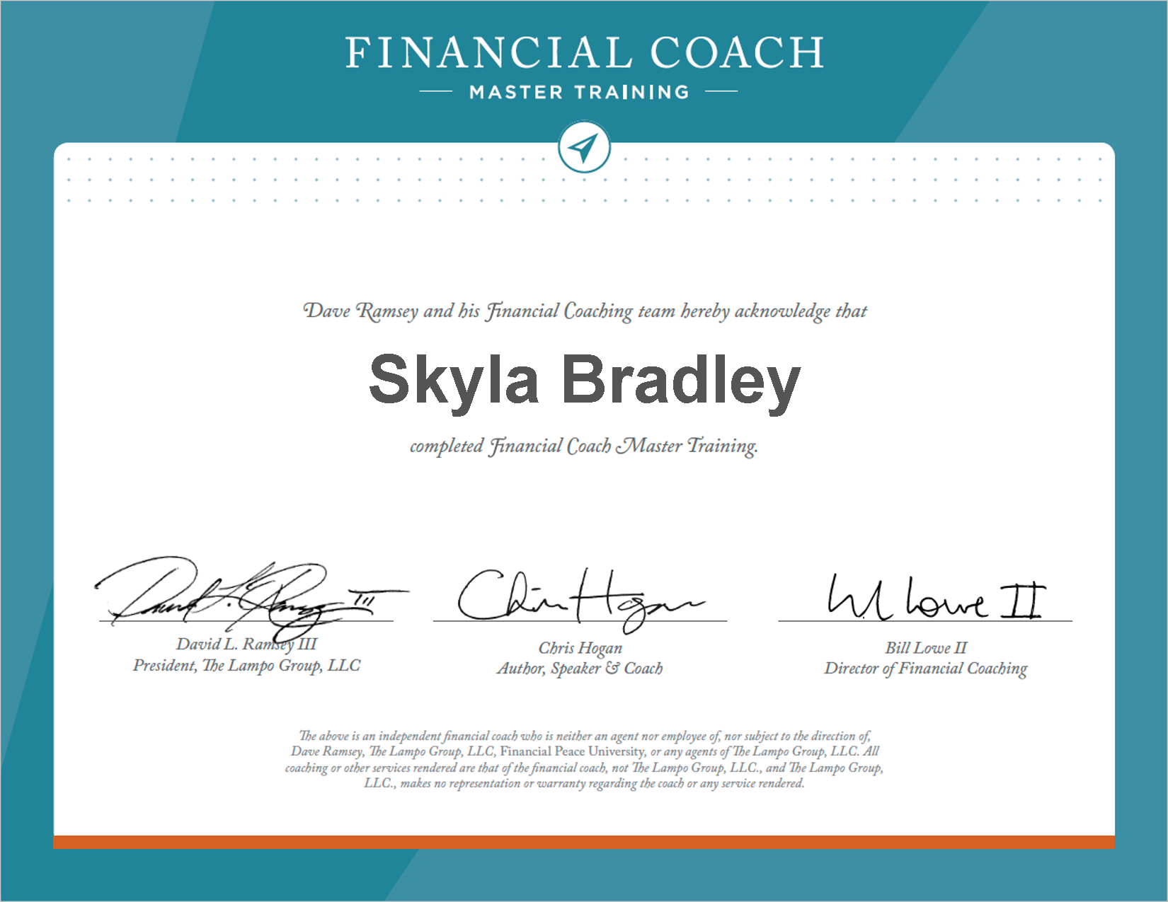 As a 26-year old single professional, I had over $95k in debt on my house and student loans. Life was overwhelming financially! Thankfully in March 2010, I heard about Dave Ramsey and went to his Total Money Makeover Conference in Dallas, TX. I had a lot to learn as I bought my Financial Peace University membership on a credit card!! I first took FPU in September 2011 and began coordinating FPU since March 2012 (28+ classes and counting!). I accomplished my goal in September 2018 at the age of 35! I passionately decided to use my increased cash flow to become a Life/Financial Coach to help others find the freedom and hope I had found. As a result, I completed the Financial Coach Master Training from Ramsey Solutions and have also become a Preferred Ramsey Coach. Additionally, I am a Certified Life Coach and have received my Advanced Diploma in Christian Life Coaching from The American Association for Christian Counselors. With these tools, I will coach you to do whatever you are called to do even better.